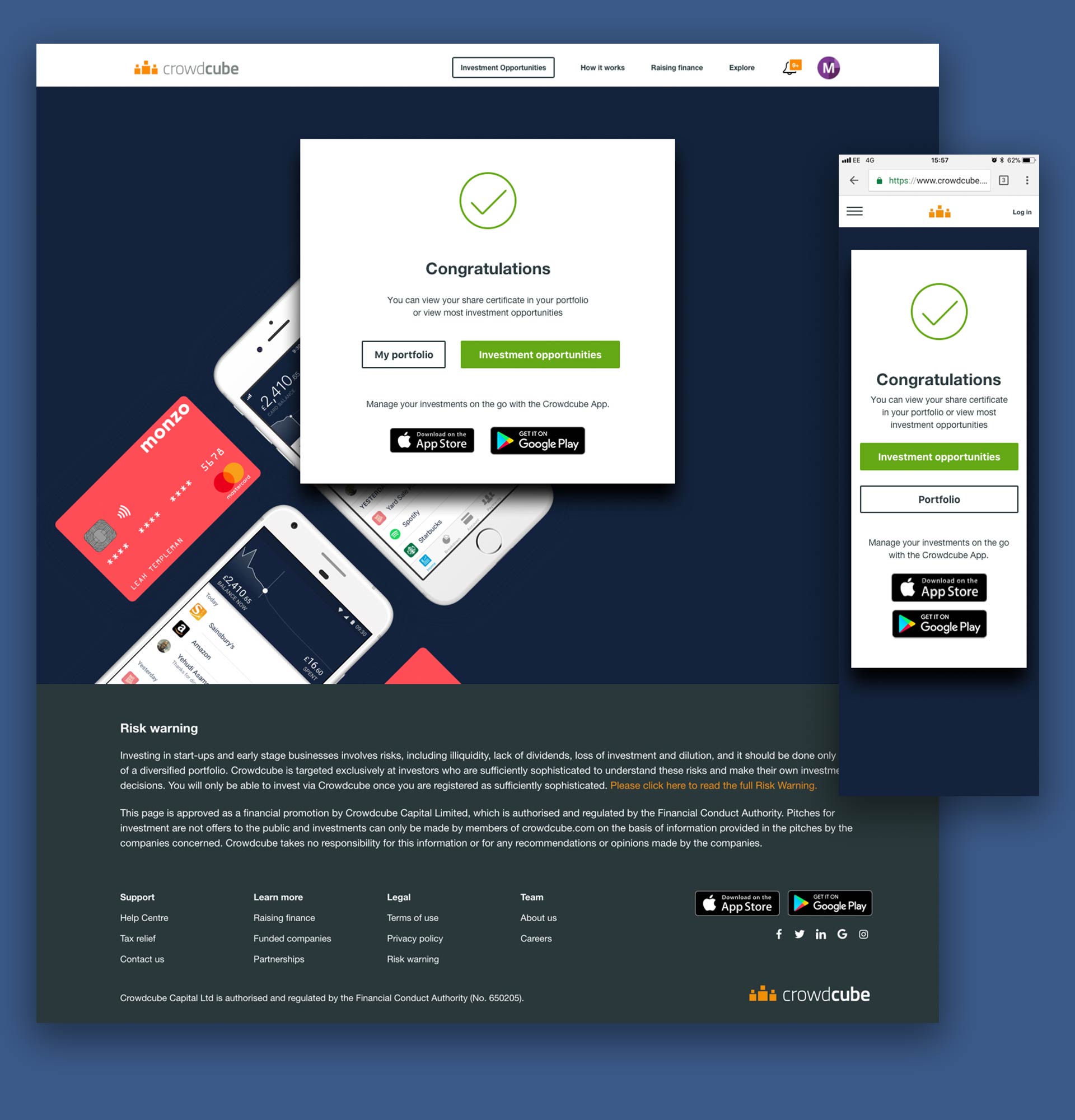 Monzo investors needed to be able to link their account with a Crowdcube account so we needed to present a page that would contain the functionality to do this. The investors also needed access to their portfolio once the account was created.