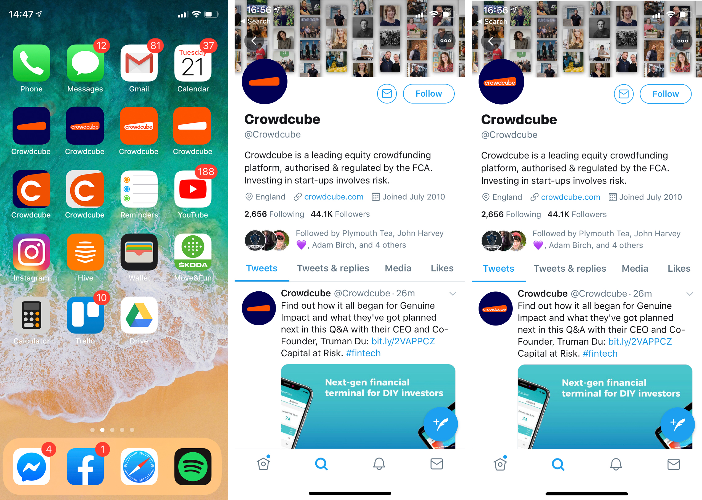 Due to the way our logo was designed, when contained within a shape (app icon square, or circle) there was a lot of white space top and bottom. The wordmark ("Crowdcube") became illegible and the strong meaning it was meant to portray was becoming lost.